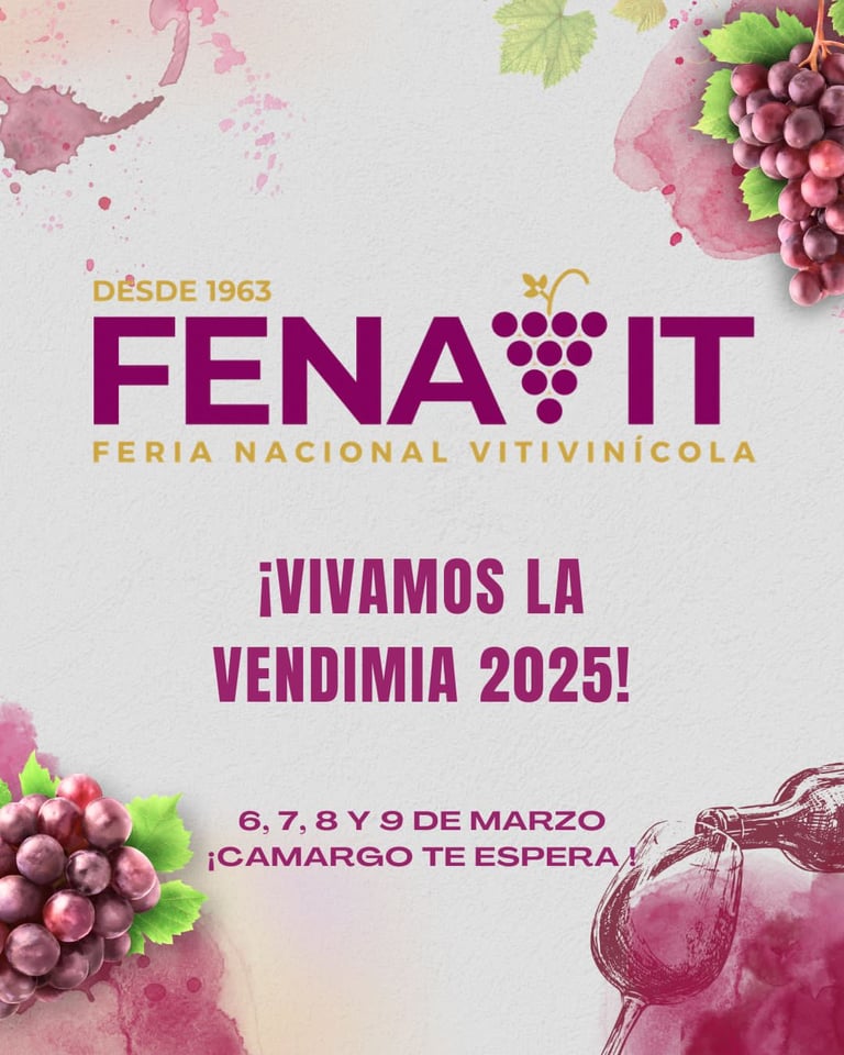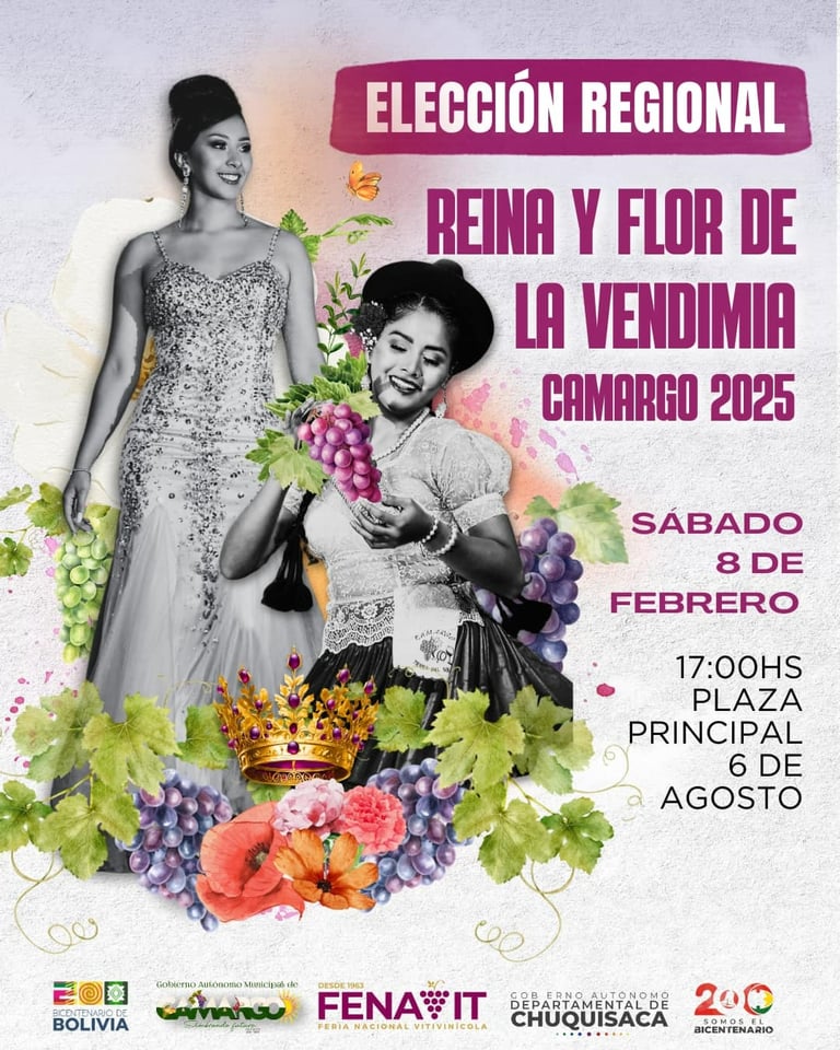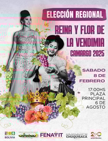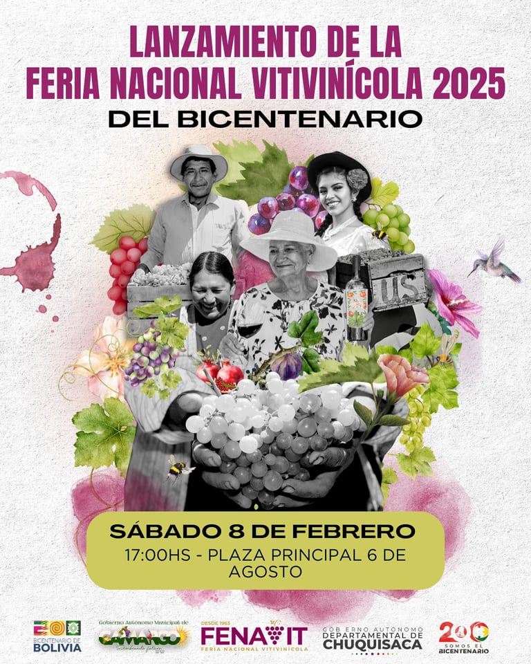Camargo se viste de gala y presenta una versión de su Feria Nacional Vitivinícola - FENAVIT 2025, que reúne a productores, bodegueros y consumidores del mejor vino, singani y uva de Bolivia y Sudamérica. La Feria contará con la asistencia de autoridades municipales, regionales, departamentales y nacionales.